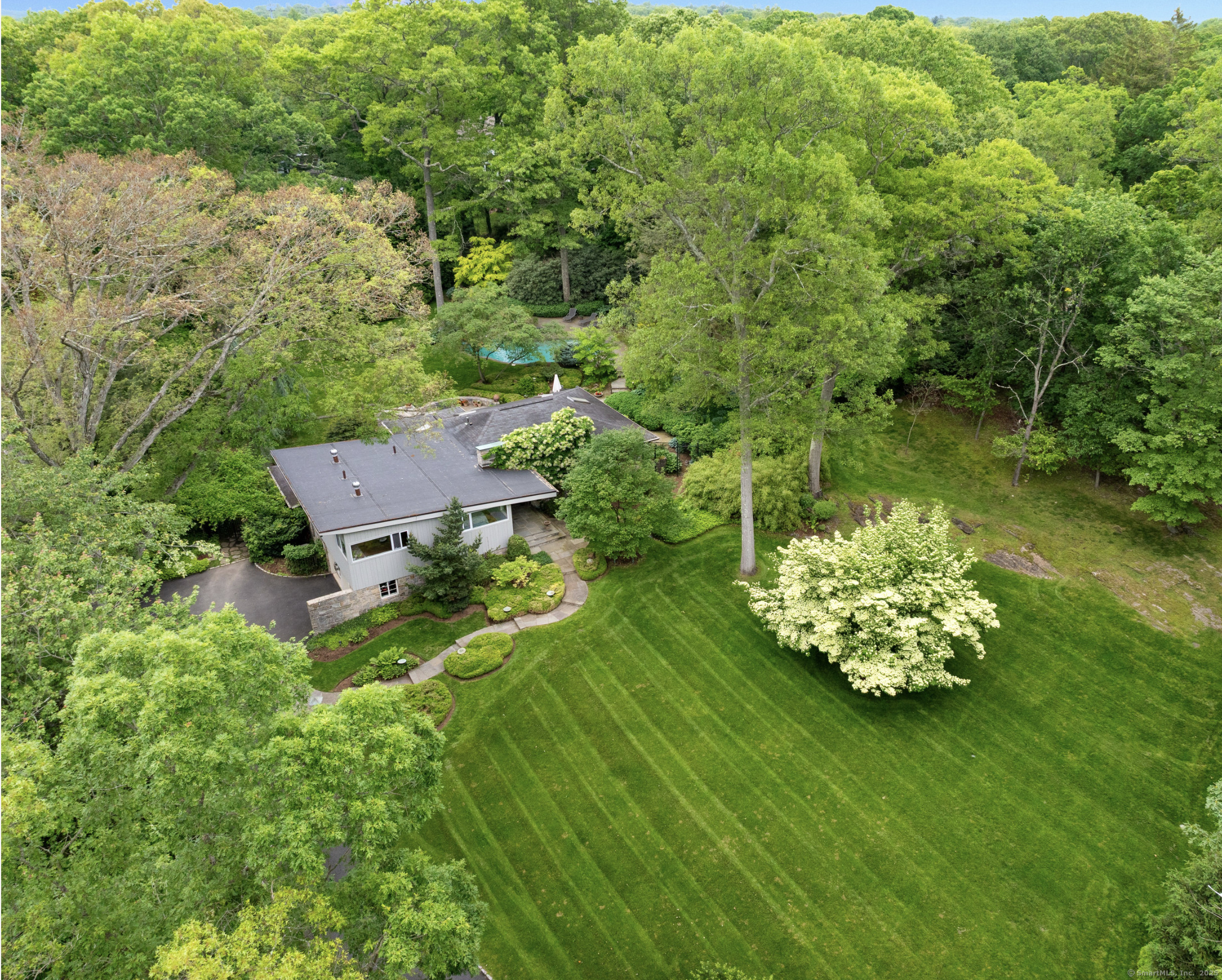Experience the best of Westport living in this stunning Mid Century Modern residence set on 1.87 prime acres in the heart of town. This is all about the property! Tucked away on a beautifully landscaped property, this 4-bedroom home offers the perfect blend of privacy, modern design, and everyday convenience. Inside, expansive windows bathe the open living spaces in natural light, with soaring ceilings and a seamless indoor-outdoor flow. The spacious kitchen, elegant dining area, and inviting living room create an ideal setting for entertaining. Retreat to a serene primary suite with views of the picturesque grounds. Step outside to your own private oasis featuring a sparkling in-ground pool, lush lawns, and mature plantings- fully fenced and perfect for relaxation or play. Enjoy the combination of public water, and town sewer. Located minutes from downtown shopping, restaurants, beaches, top-rated schools, and the train. A truly exceptional offering in one of Westport's most sought-after locations.