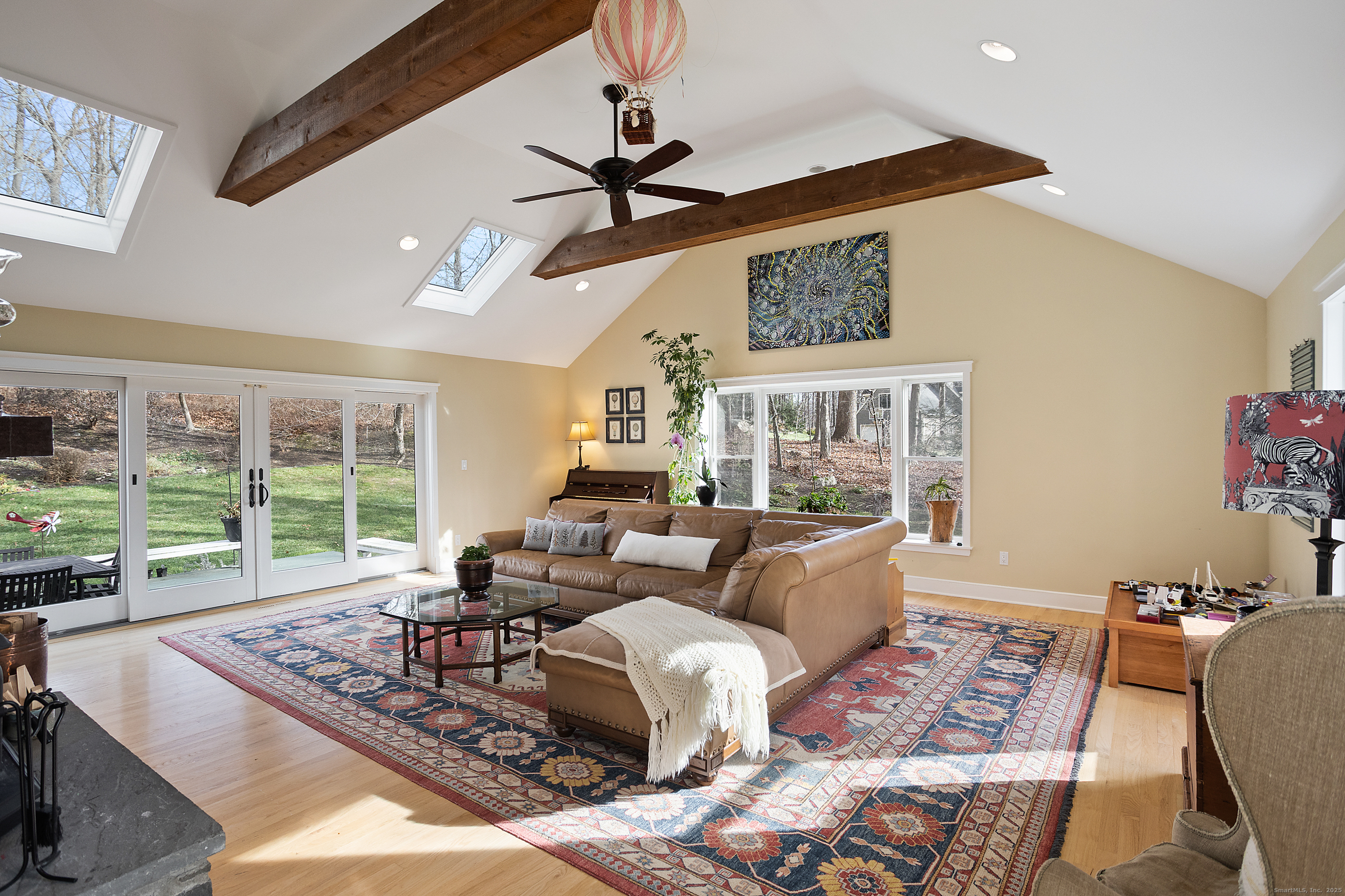 Welcome to 41 Deer Hill Rd, an elegant colonial set on just over 2 acres in one of Redding's most sought-after neighborhoods. With 3,912 SF of refined living space, this home blends timeless architectural charm with thoughtful modern updates. Detailed millwork, abundant natural light, and an intuitive flow define the main level. Two expansive great rooms anchor either side of the home with exposed beams, vaulted ceilings, and a dramatic fieldstone fireplace, w/direct access to the deck and private backyard - offering exceptional flexibility for everyday living and effortless entertaining. A formal living room with fireplace and a gracious dining room create a warm, classic setting for gatherings. The main level is rounded out by a powder room and full bath, adding convenience for guests and a busy household. All 3 full bathrooms have just undergone a complete renovation, each one thoughtfully designed w/elevated finishes and a sophisticated, modern aesthetic. They are truly stunning and bring a fresh, luxurious feel to the home. Upstairs, 4 generous bedrooms include a dreamy primary suite w/wood-burning fireplace, walk-in closet, and spacious bath. Another bedroom enjoys a charming balcony, perfect for morning coffee. A full, unfinished basement offers abundant storage and potential for future customization. A rare opportunity to secure a beautifully updated home that pairs enduring style with practical functionality in a highly desirable, walking-friendly neighborhood