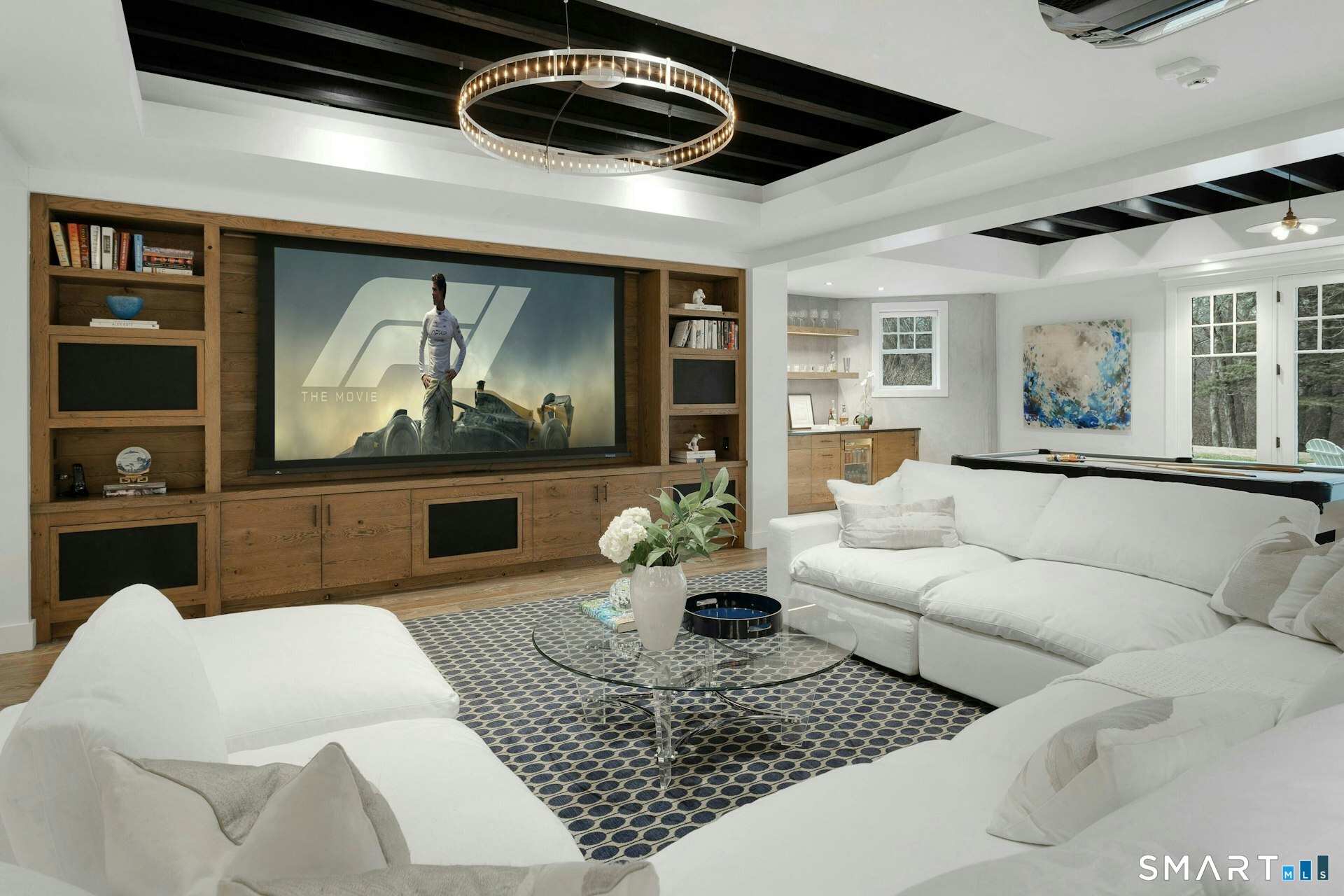 On a small lane of three homes on 1.5 private acres, this custom shingle-style home offers refined design and exceptional craftsmanship throughout. Thoughtfully sited to capture southern, western, and eastern exposures, the home captures natural light from sunrise to sunset. Architectural highlights include intricate millwork, wide oak-plank flooring, dramatic ceilings, arched doorways, and extensive built-ins. The chef's kitchen features custom cabinetry, a striking handcrafted zinc island, and Wolf and Sub-Zero appliances. Oversized Kolbe windows frame views of the parklike property and bluestone patio, complete with an outdoor fireplace, built-in grill, sitting wall, and covered lounge area. The walkout lower level offers a Stewart Filmscreen theater, fireside library, gym, and wet bar. Lutron HomeWorks provides seamless whole-home lighting control, complemented by integrated audio with 27 speakers for an elevated smart-home experience. An oversized 3-car garage with cathedral ceilings can accommodate two car lifts and offers exceptional flexibility for storage, hobbies, or entertainment. The third floor offers outstanding potential for additional living space, with major infrastructure elements already in tact. Energy-efficient Geothermal HVAC and extensive LED lighting enhance comfort and efficiency throughout. Impeccable and move-in ready, this home was designed for effortless indoor outdoor living in a walk to town estate setting. Ample space for pool and ADU